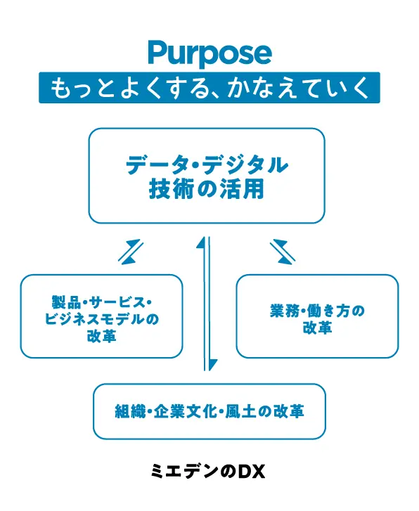 わたしたちミエデンは、地域や社会全体のDX(デジタル・トランスフォーメーション)を力強く推進することを使命とするIT企業です。そのためにも、まず自分たちからDXを実践し、変革の先頭に立つ必要があると考えています。DXの定義はさまざまですが、ミエデンでは新たなパーパス「もっとよくする、かなえていく」に基づき、データ・デジタル技術を活用しながら、3つの改革を実行・推進していくことを「DX」と定義しました。kintoneなどを活用した業務の効率化や生産性の向上はもちろんのこと、社内における業務プロセスのデジタル化やデータ活用、AIやRPA(ロボティック・プロセス・オートメーション)など先進技術の導入にも積極的に取り組んでいます。