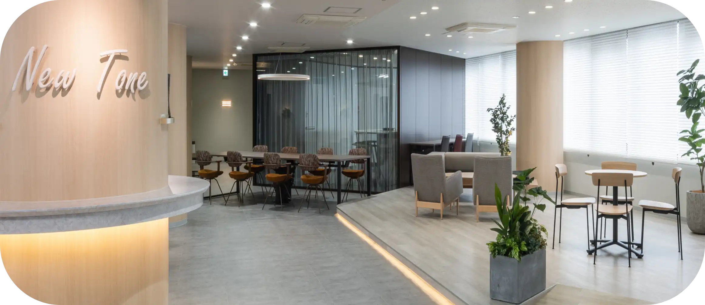 当社では中期経営計画の中で「事業を支える環境の整備」を重点取組事項のひとつに位置づけ、快適性と創造性を兼ね備えた次世代のワークプレイス構築に向け、戦略的なオフィス改革を計画。『交わる、変わる』をテーマに、本社ビル2階のリノベーションを実施しました。 新しいフロアの名は「New Tone(ニュートーン)」。デザインが異なる机や椅子、ソファのほか、移動型のホワイトボードを配置することで「偶然の出会いから生まれるコミュニケーション」「新たなアイデアの創出」を促しています。また、ちょっとした休憩に使えるリクライニングルームや軽食やドリンクをいつでも購入できる無人コンビニも併設し、思考を整理しマインドを切り替える場として社員の働きやすさ向上にも貢献しています。