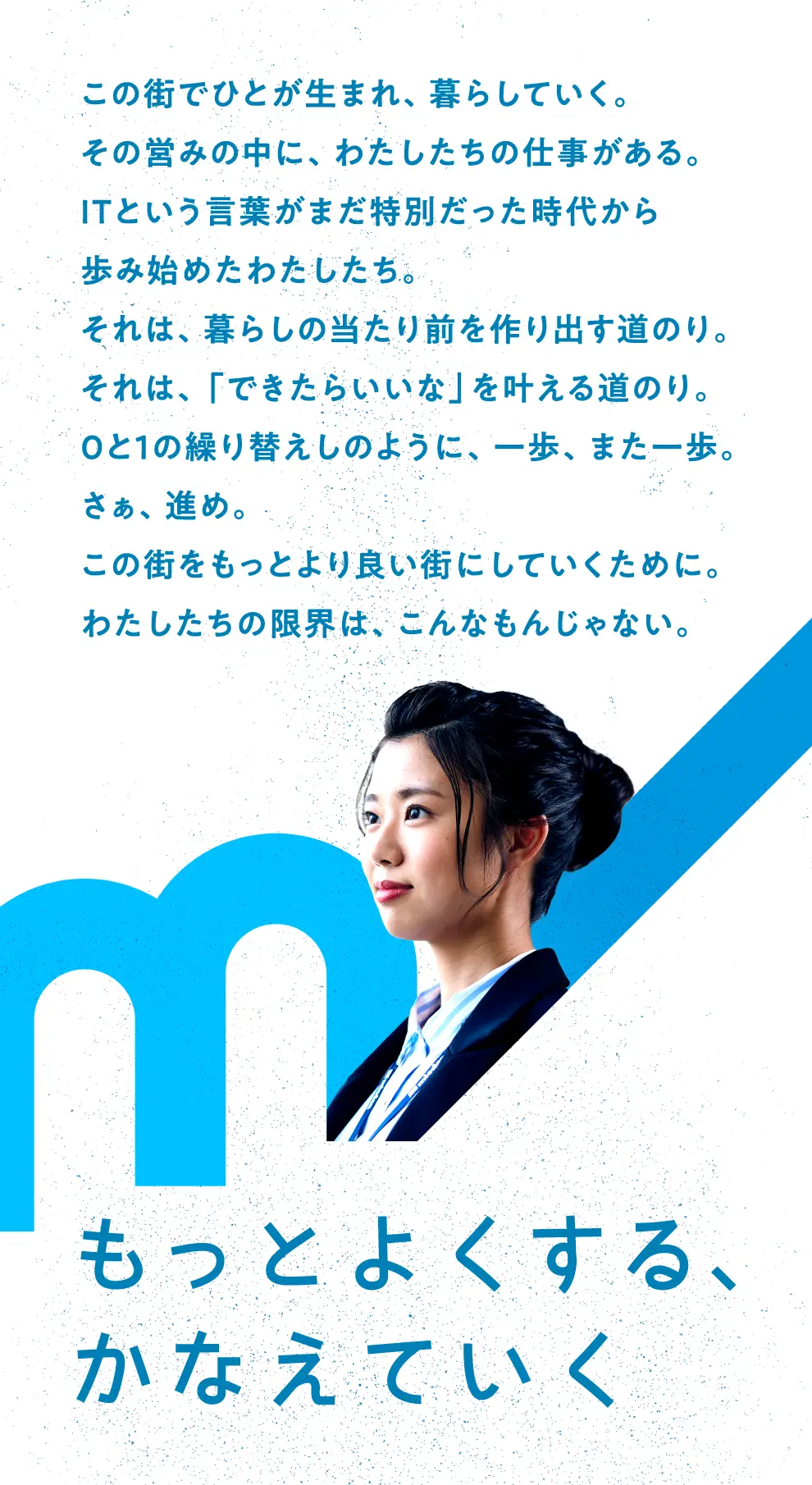 私たちはお客様の課題解決に貢献することで、よりよい地域社会の創造に貢献してきました。今後はお客様の課題解決のみならず、ビジネスモデルの共創といった新しい価値を付加できるようにサービス提供していきます。それはお客様と私たちのみならず、社会全体を豊かにすることに繋がっています。アイデアと先進技術を駆使して、これまで以上の地域社会への貢献を目指し、ともに歩んで行きましょう。
